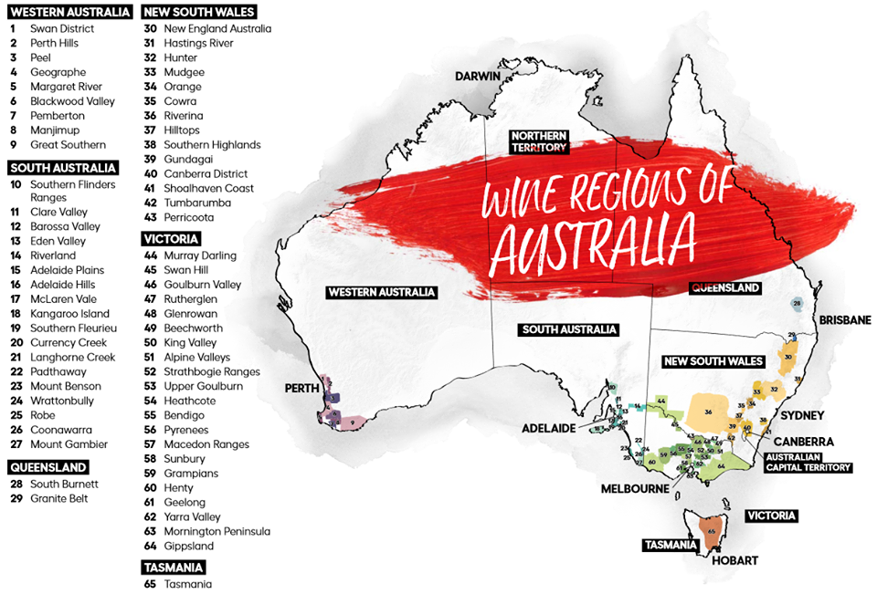 Σε αυτό το σημείο χρήσιμο είναι να αναφέρουμε πώς οι 65 ξεχωριστές αμπελουργικές ζώνες της, έχουν έκταση περίπου 135.000 εκτάρια, που αντιστοιχεί στο 0,2% της έκτασης της Αυστραλίας και ισούται σχεδόν με αυτές του Μπορντό και της Βουργουνδίας, μαζί… Σε αυτές λοιπόν τις μικροσκοπικές για την Αυστραλία εκτάσεις οινοποιούνται πάνω από 100 διαφορετικές ποικιλίες σταφυλιών, με κυριότερες αυτές των Semillon, Chardonnay, Riesling όσον αφορά τις Λευκές και Shiraz, Cabernet Sauvignon και Grenache για τις Ερυθρές.